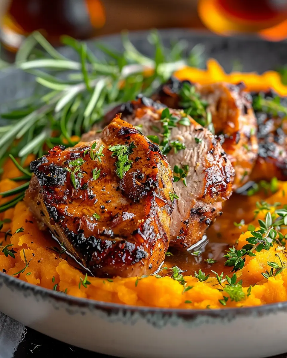 - Serve the sliced pork over the mashed sweet potatoes, drizzled with the cooking juices.