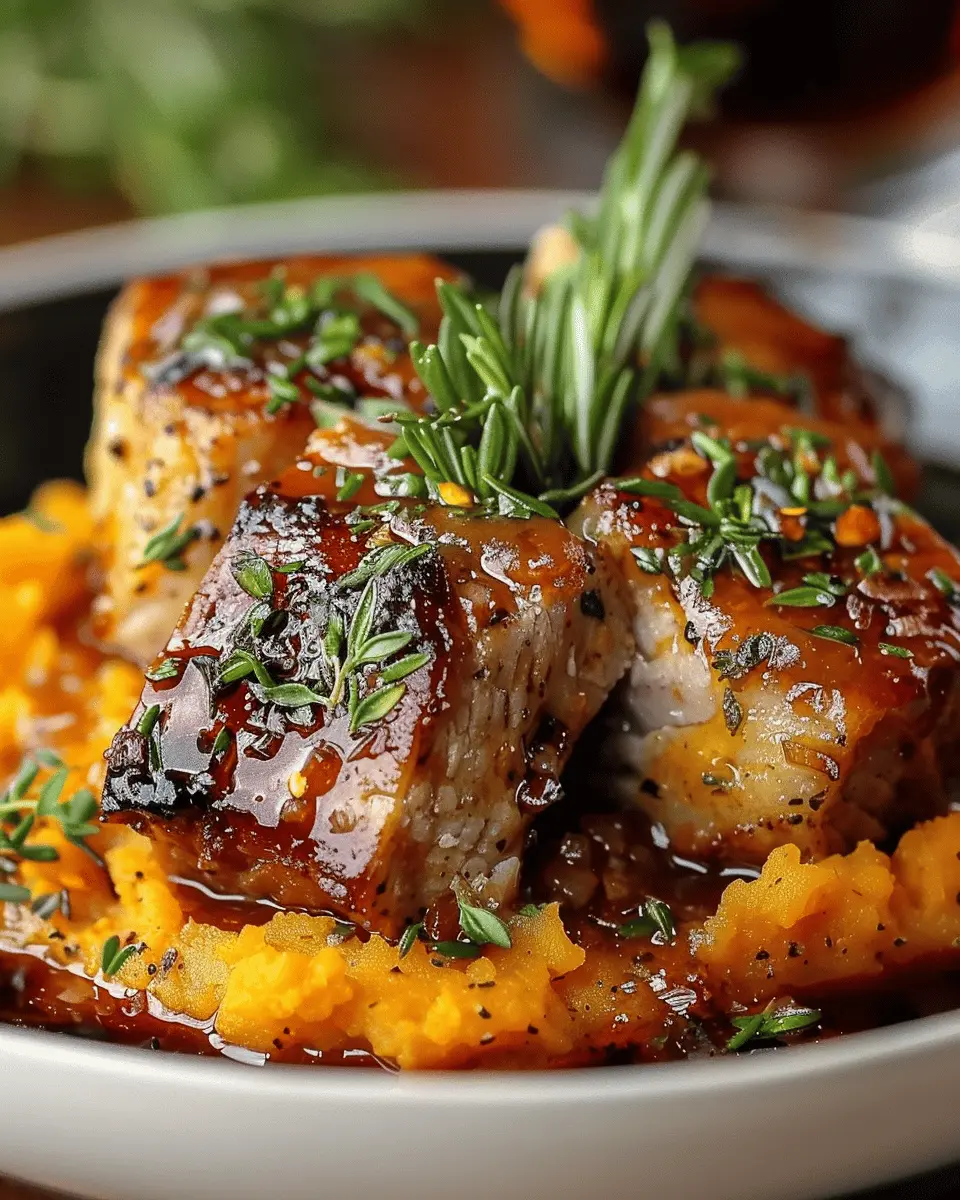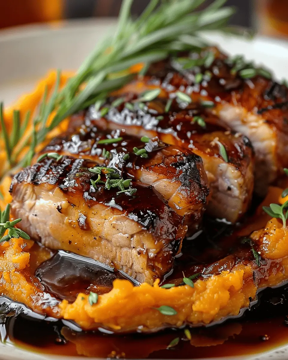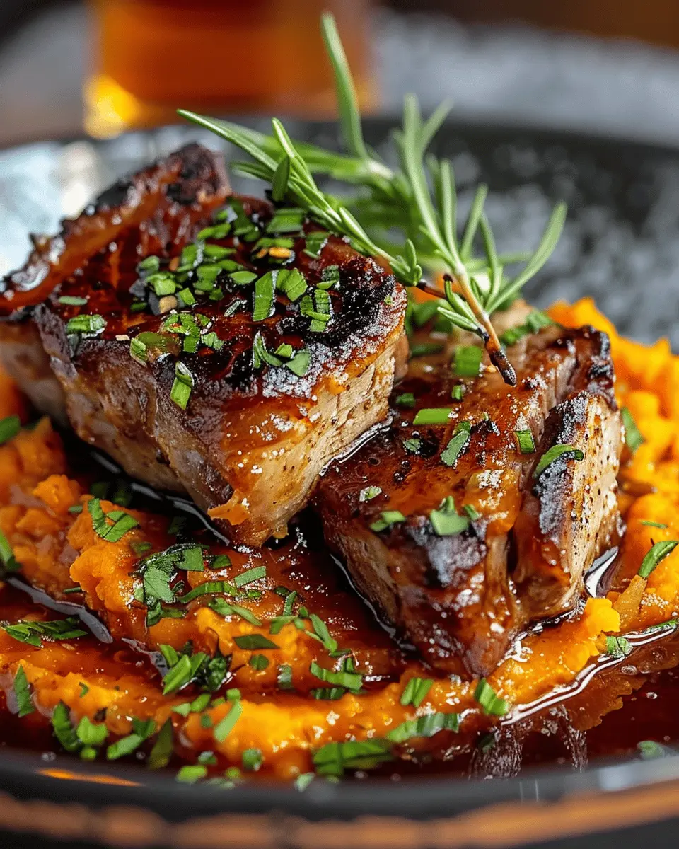 - Surround the pork with a scoop of creamy mashed sweet potatoes, allowing their vibrant orange color to pop against the dish.