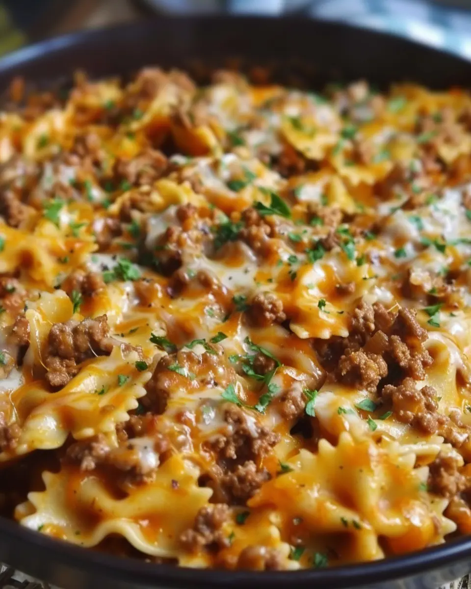 Now that you have a beautiful sauce, it’s time to join forces with the bowtie pasta and spiced ground beef. Add the drained pasta directly into the skillet, gently tossing everything together until each piece is coated in that creamy goodness. If the mix feels too thick, use the reserved pasta water a splash at a time until you reach your desired consistency. This starchy pasta water is a chef’s secret weapon!