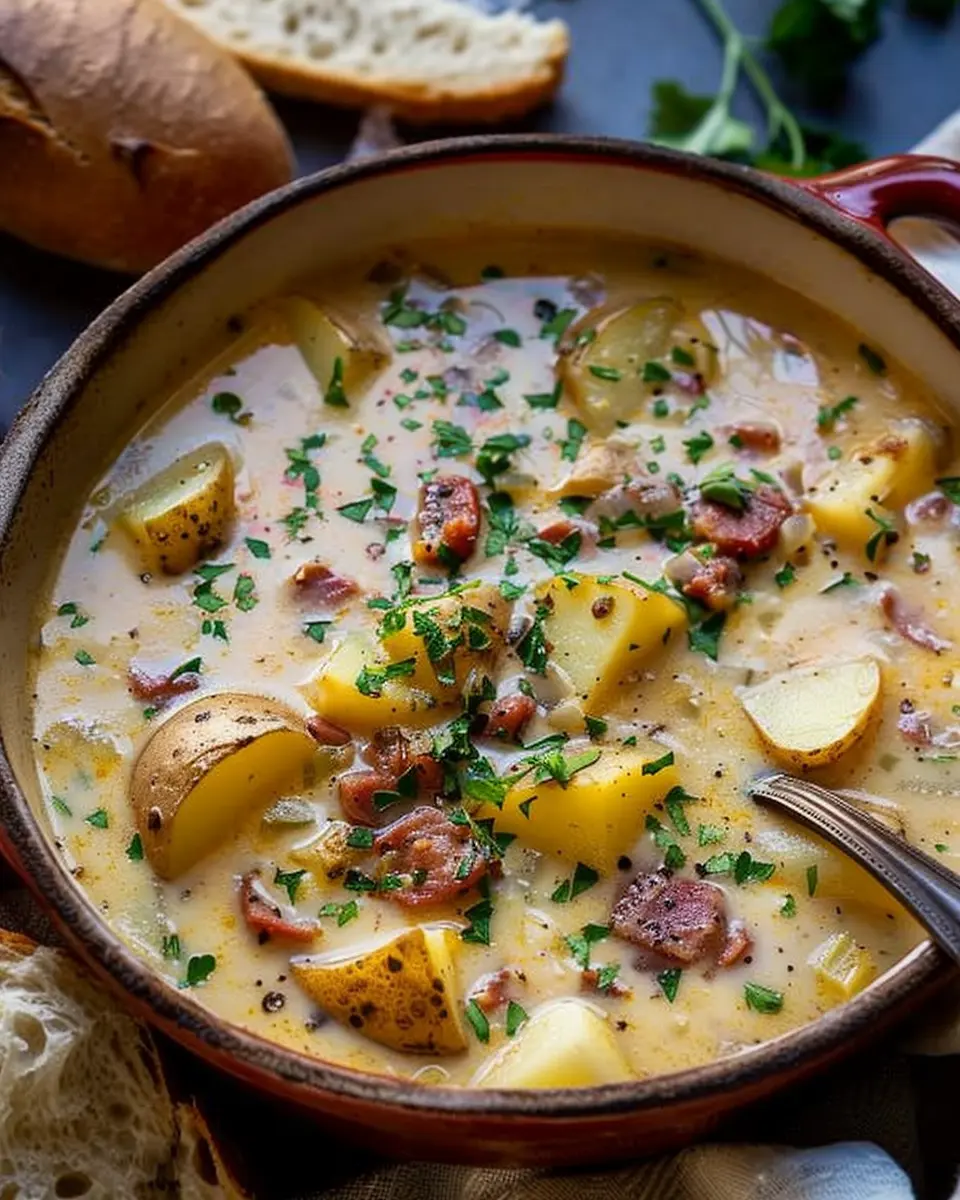 A creamy and flavorful soup that combines the heartiness of potatoes with the smoky flavors of turkey bacon and chicken ham, perfect for a comforting meal.