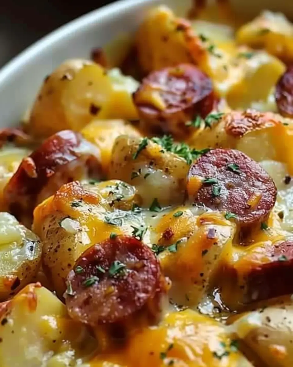 Enjoy a delightful dish of Cheesy Ranch Potatoes and Smoked Sausage that brings warmth and comfort to your meals.