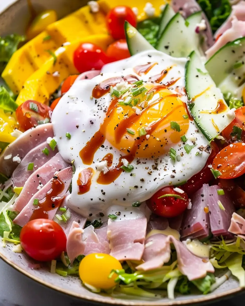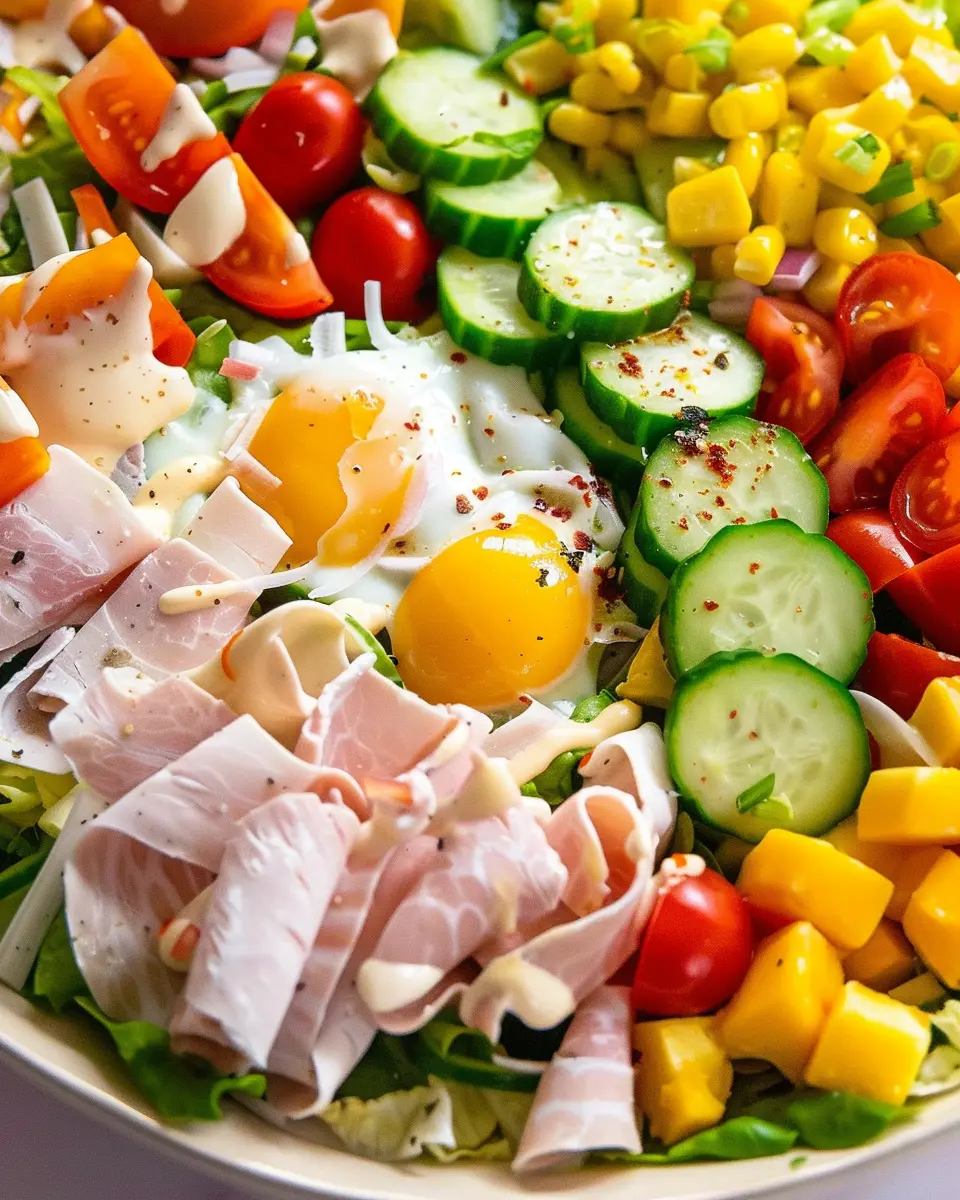 Enjoy a delightful Chef Salad made with fresh ingredients, including turkey bacon and chicken ham for a delicious twist.