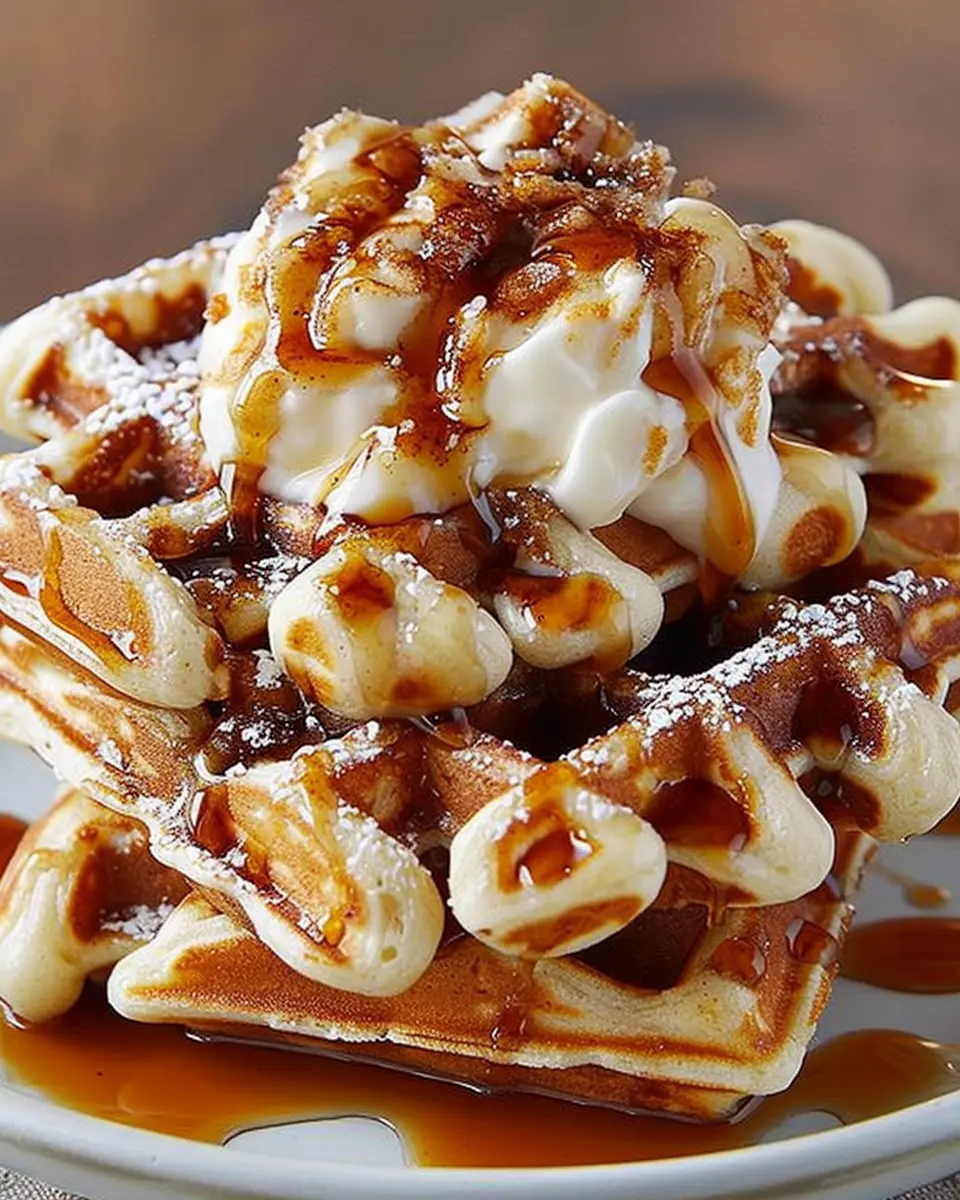 Indulge in the delightful combination of cinnamon rolls and waffles with a cream cheese twist. Perfect for breakfast!