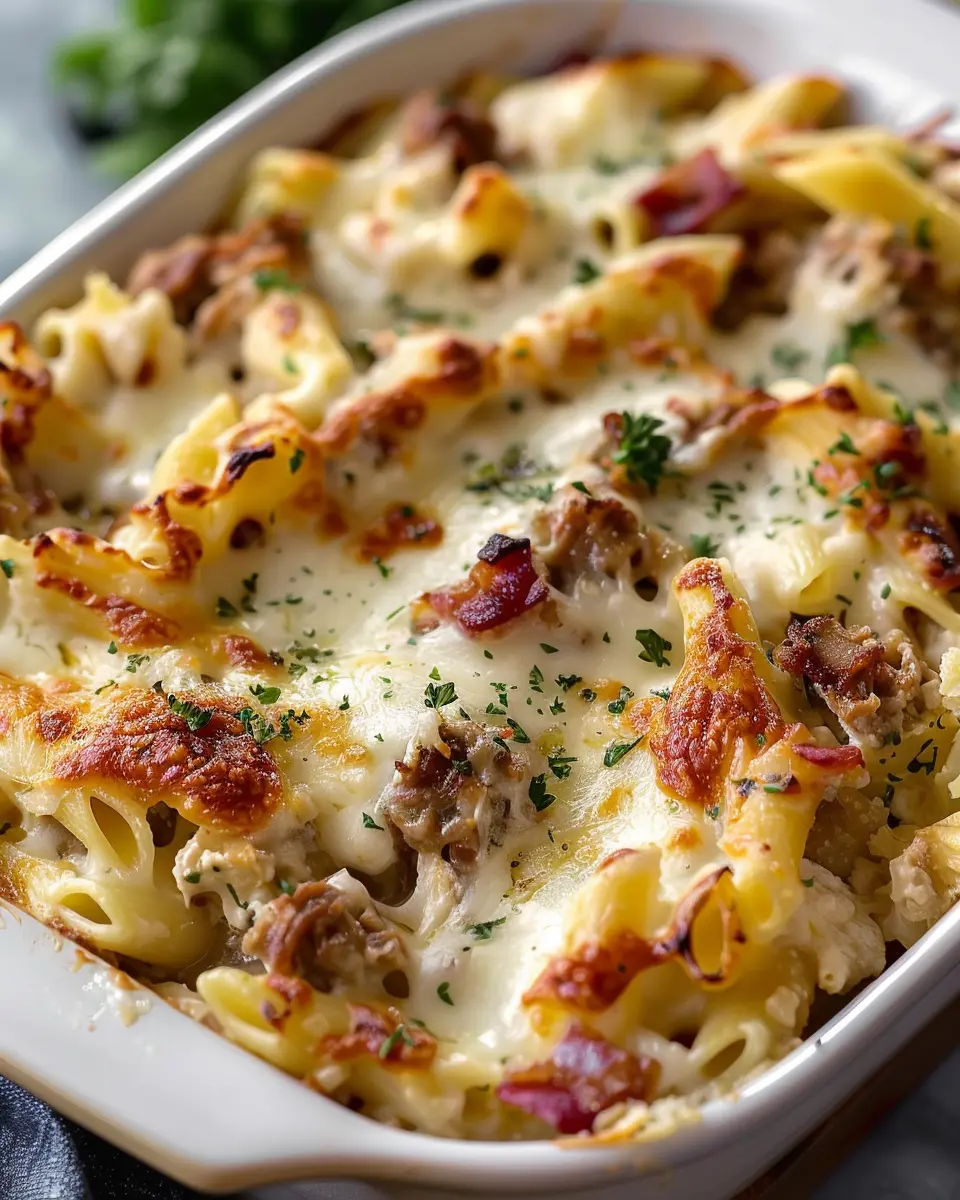 A delicious casserole combining turkey bacon and chicken ham for a comforting meal.