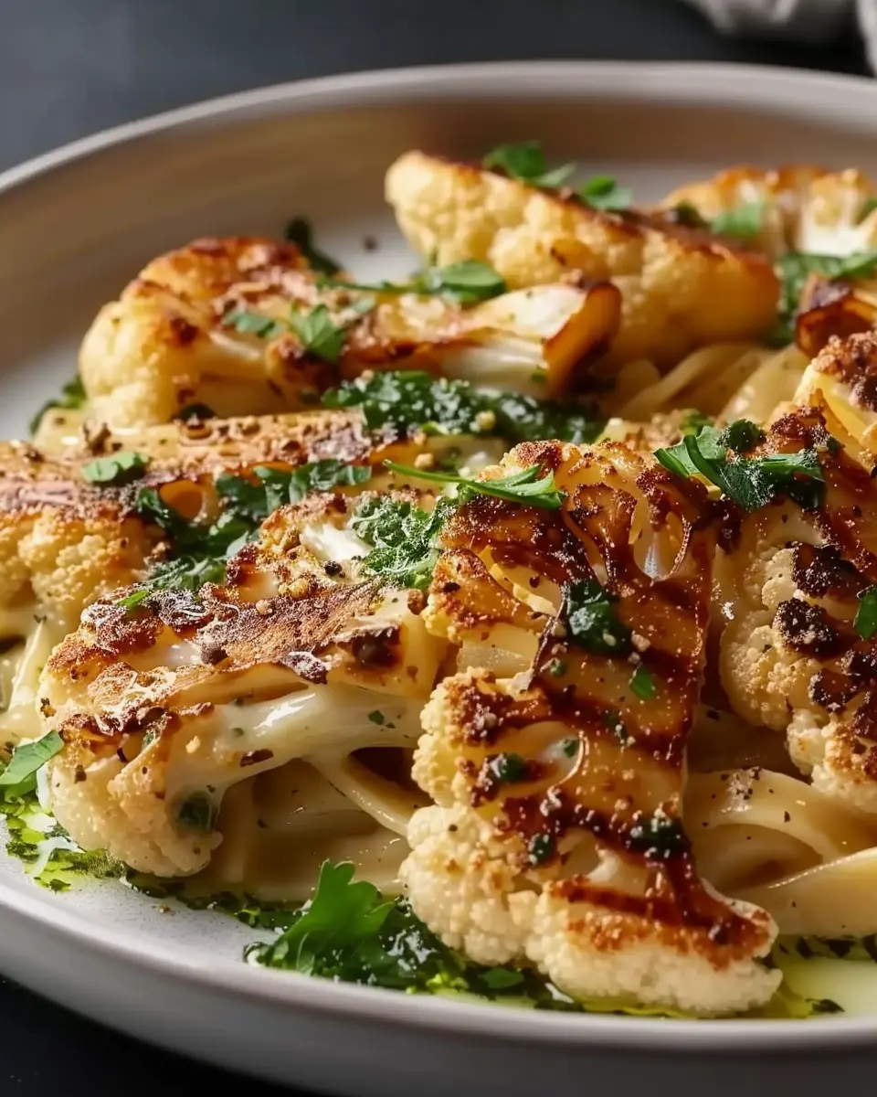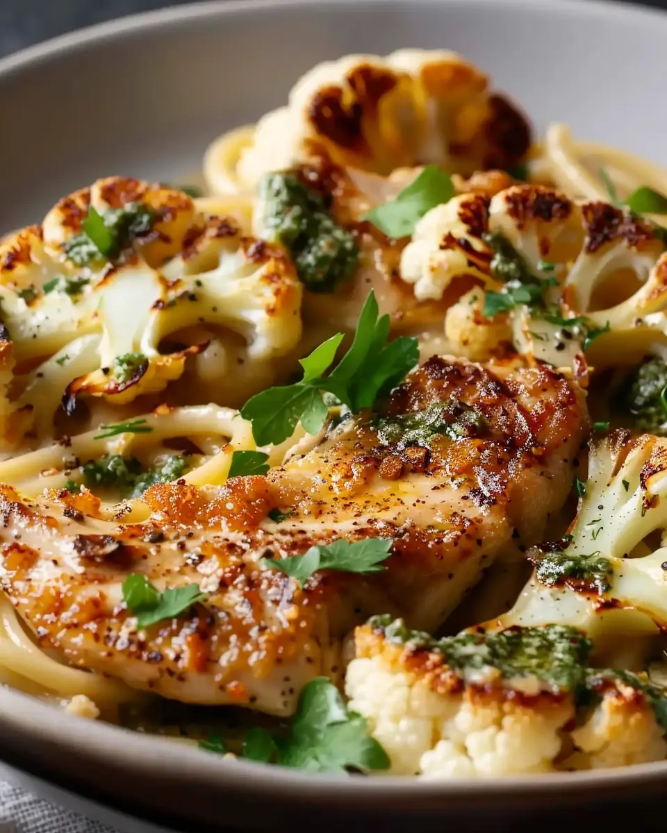 A comforting dish featuring creamy chicken and tender cauliflower steak, perfect for family gatherings.