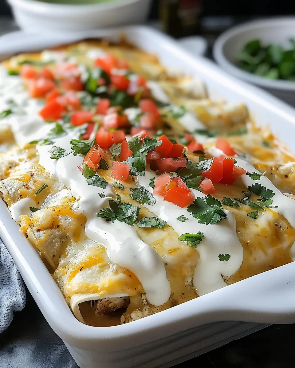 Presentation matters, especially when you’re sharing a meal with loved ones. To make your creamy queso chicken enchiladas shine, top them with freshly chopped cilantro, a dollop of sour cream, or some slices of avocado. A squeeze of lime juice can also brighten the dish and enhance its flavors. And don’t forget about the appeal of finely diced red onions or jalapeños for those who like a bit of heat. Your table will look and taste amazing!