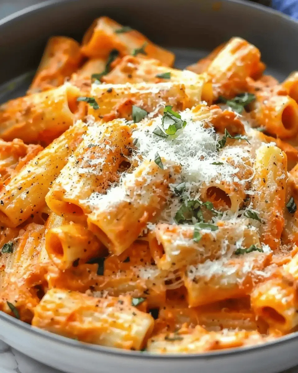 Cook your rigatoni according to the package instructions until al dente. Drain it and add it straight into your sauce mixture. Use tongs to toss everything together, ensuring the pasta is fully coated in that creamy, dreamy sauce.