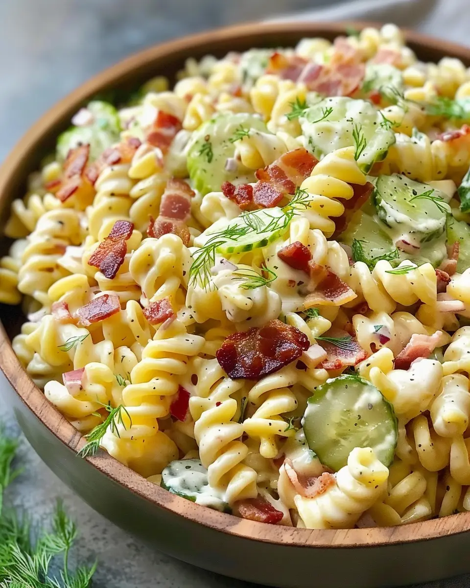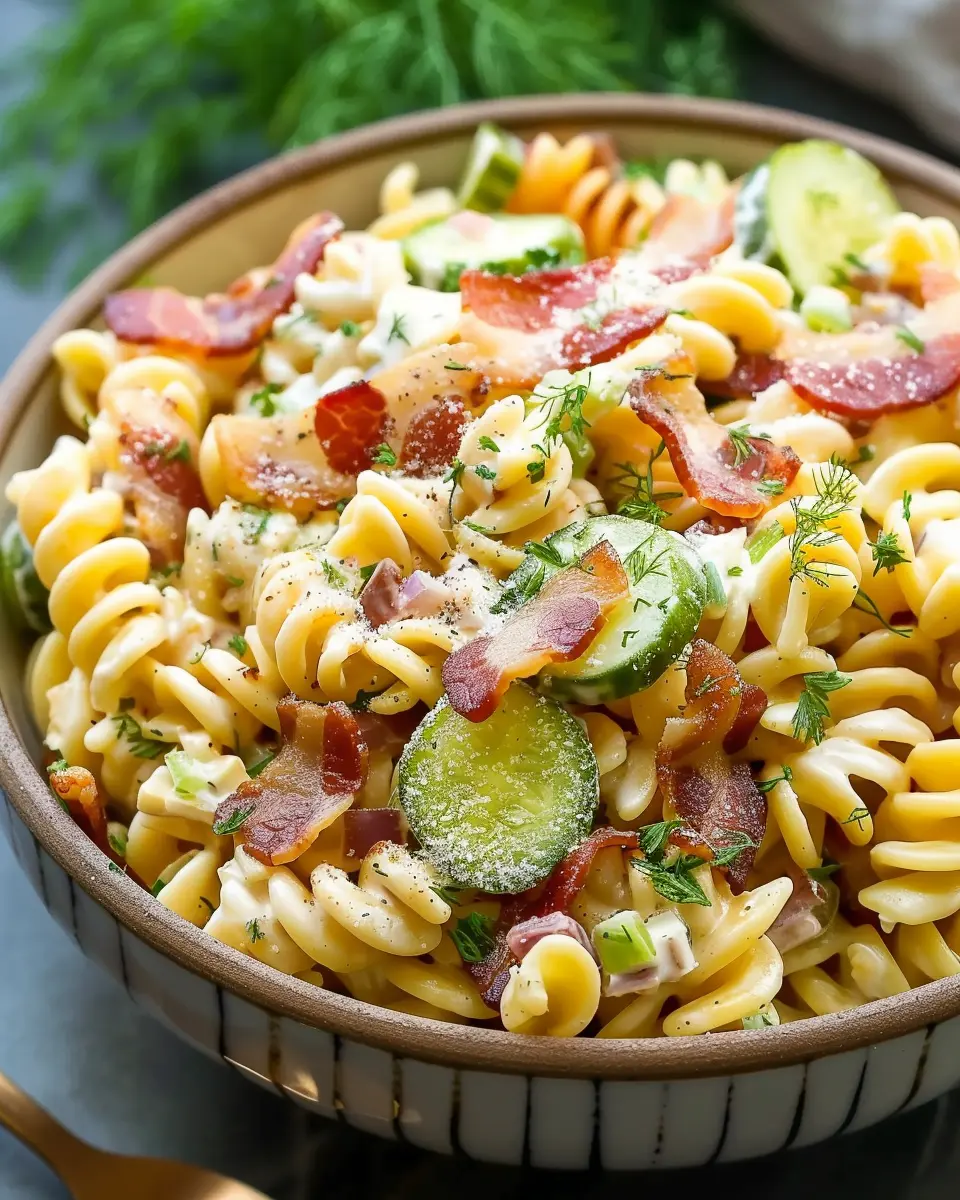 A delicious and refreshing pasta salad with a tangy dill pickle and crispy bacon twist that will surely impress your guests.
