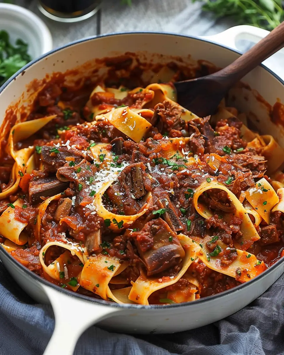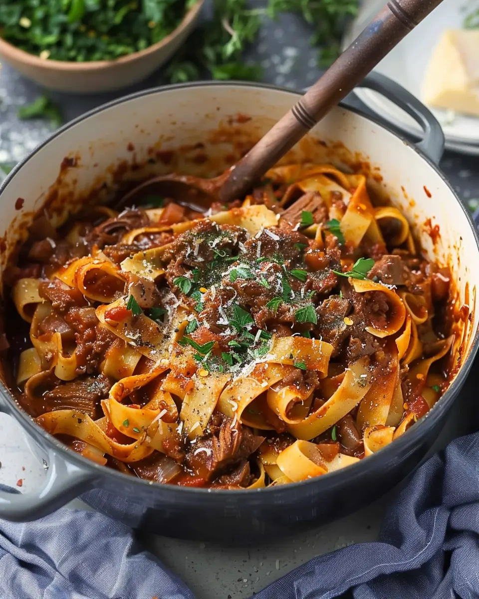 A rich and flavorful Dutch oven short rib ragu served over pappardelle pasta, perfect for a comforting meal.