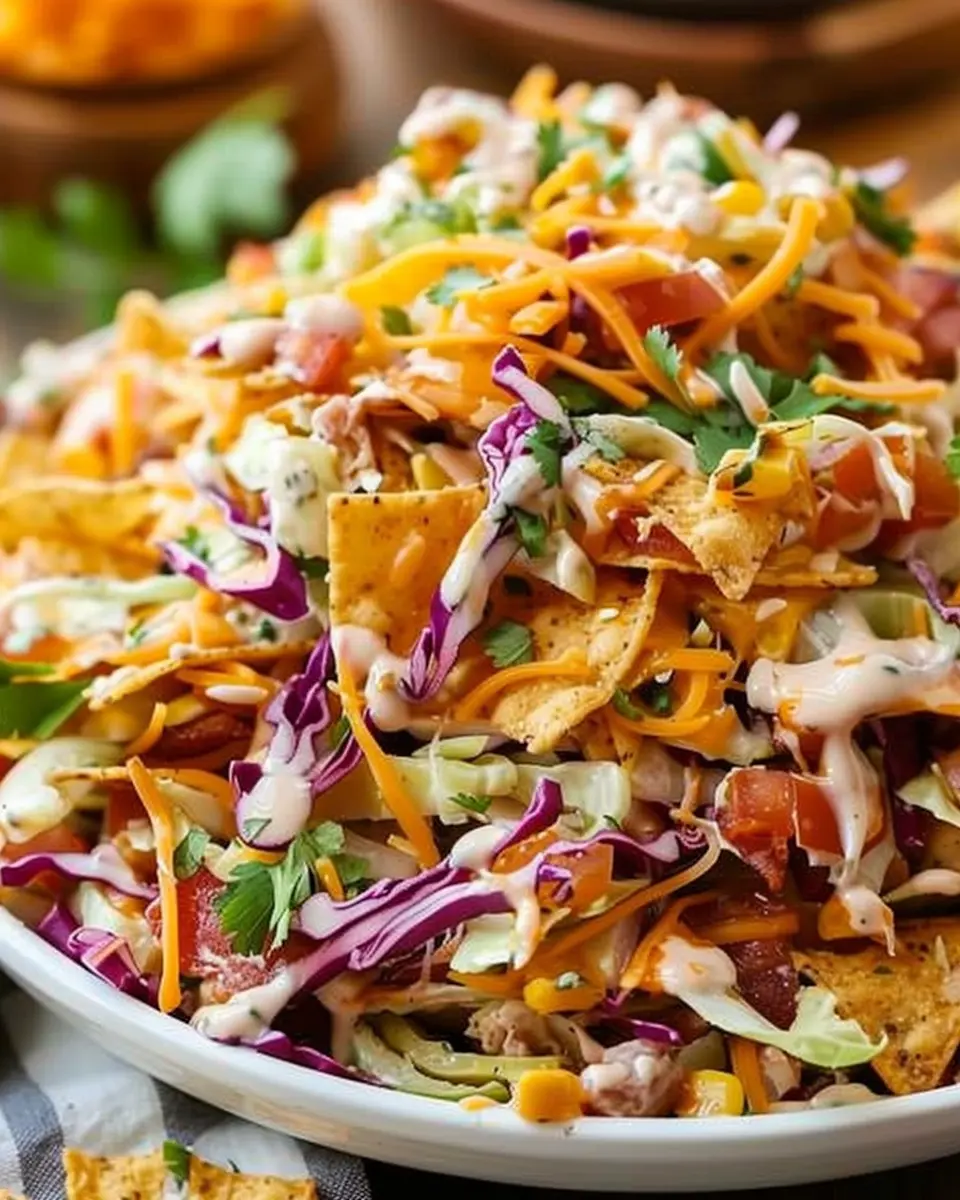Now that your salad mix and dressing are ready, it’s time for the grand assembly! Pour the chipotle dressing over the salad mix and toss until every piece is coated. The dressing should cling to all those fresh ingredients, making them even more flavorful. Finally, just before serving, fold in the Fritos. This keeps them crunchy and prevents them from getting soggy, which is key!