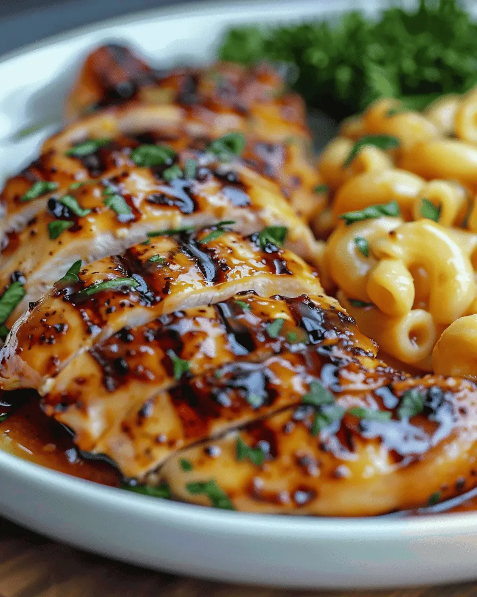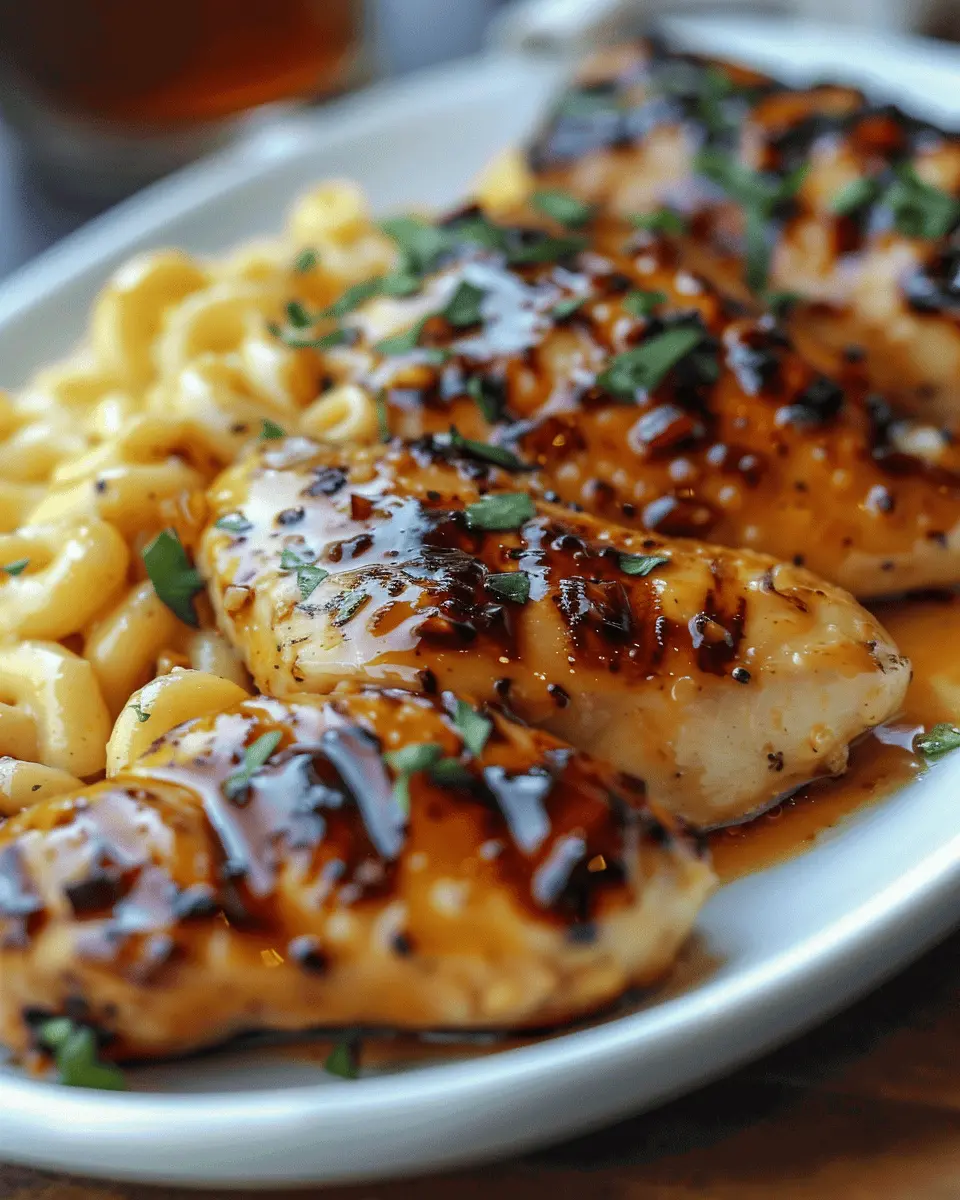 Slice the chicken breasts and drizzle the honey garlic butter sauce generously over them. Add a hefty spoon of your creamy mac and cheese on the side. For an added touch, consider garnishing your plate with chopped green onions or parsley for color and freshness.