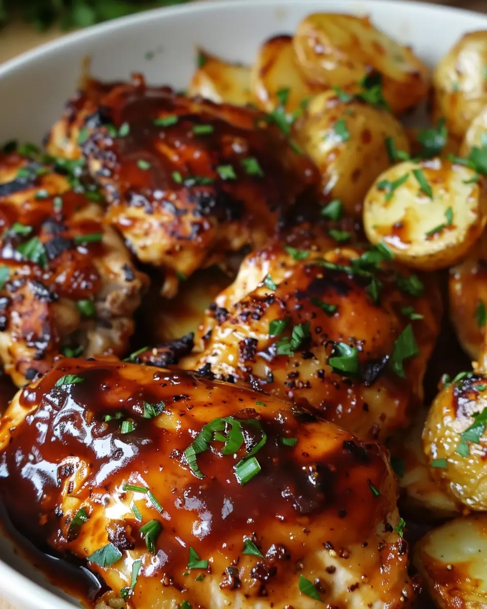 In conclusion, this Honey BBQ chicken recipe isn’t just another dinner idea; it’s a celebration of flavors that brings comfort to your busy evenings. The tender chicken, slathered in a sweet and tangy barbecue sauce, paired with garlic-roasted potatoes, elevates a simple meal into something special.