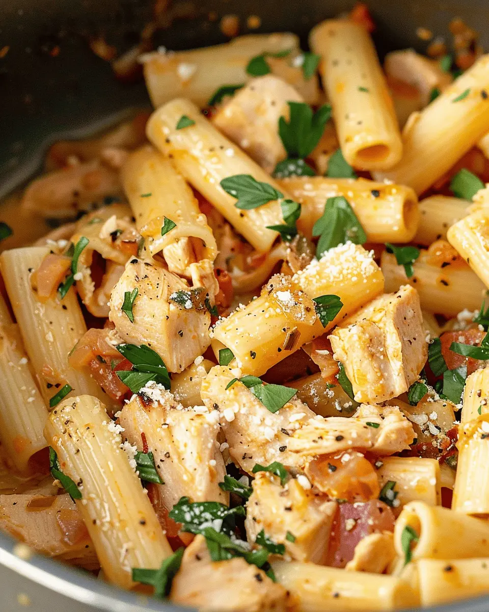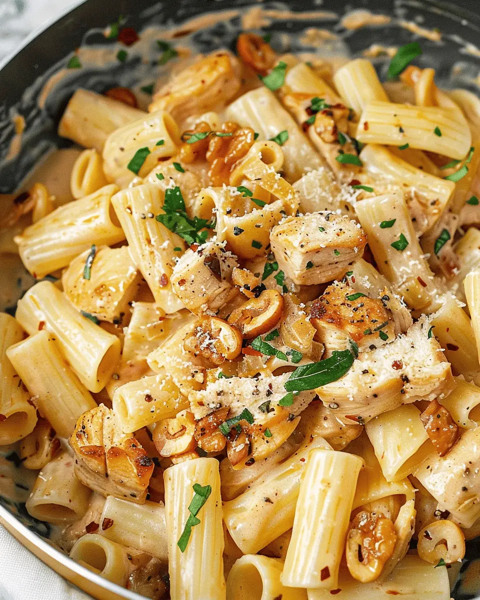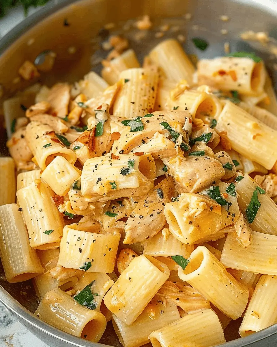• Combine Chicken and Pasta: Return the chicken to the skillet and nestle it in the sauce. Add the cooked pasta, tossing gently to coat everything evenly in the creamy goodness.