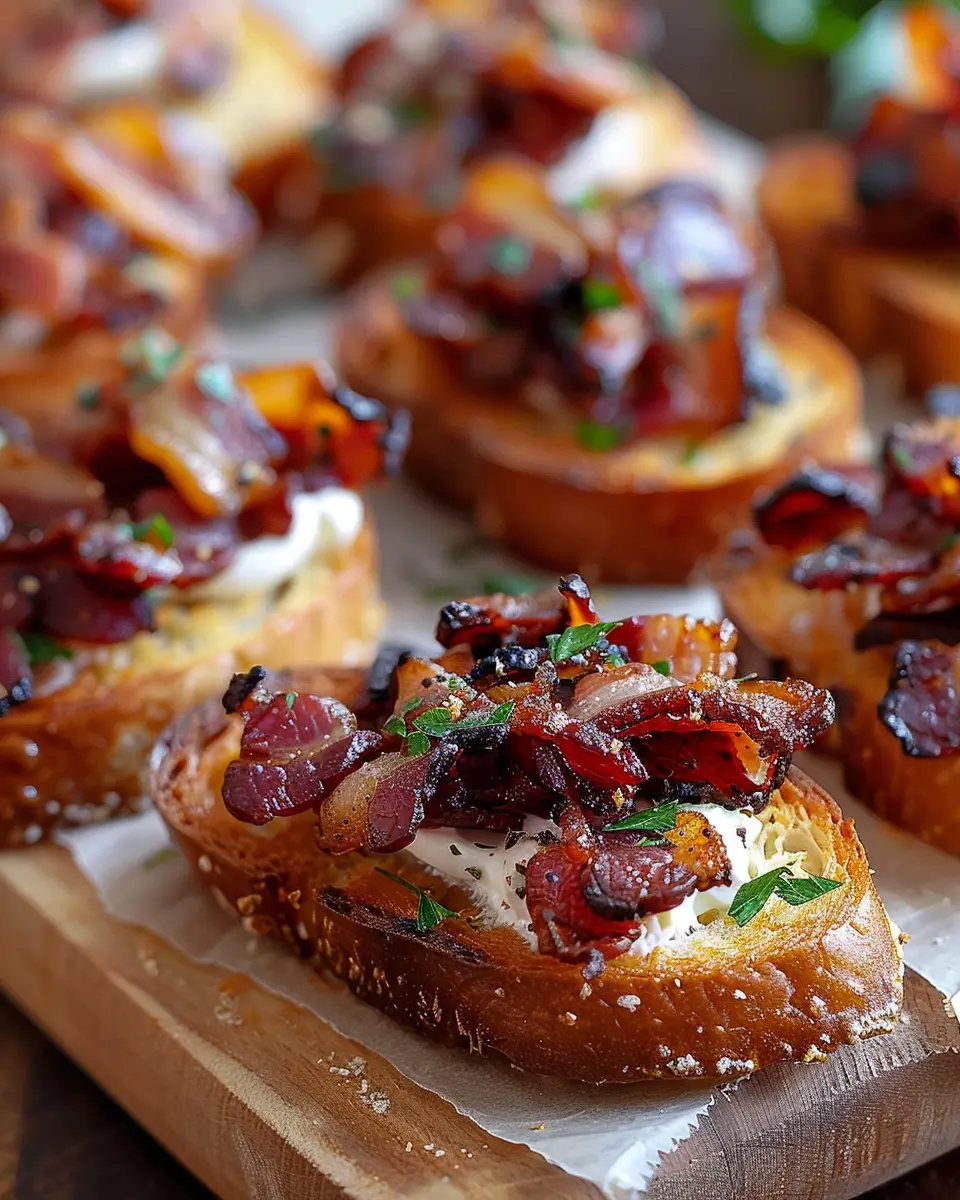 Indulge in the rich flavors of Million Dollar Turkey Bacon Crostini, a perfect appetizer for your next gathering.