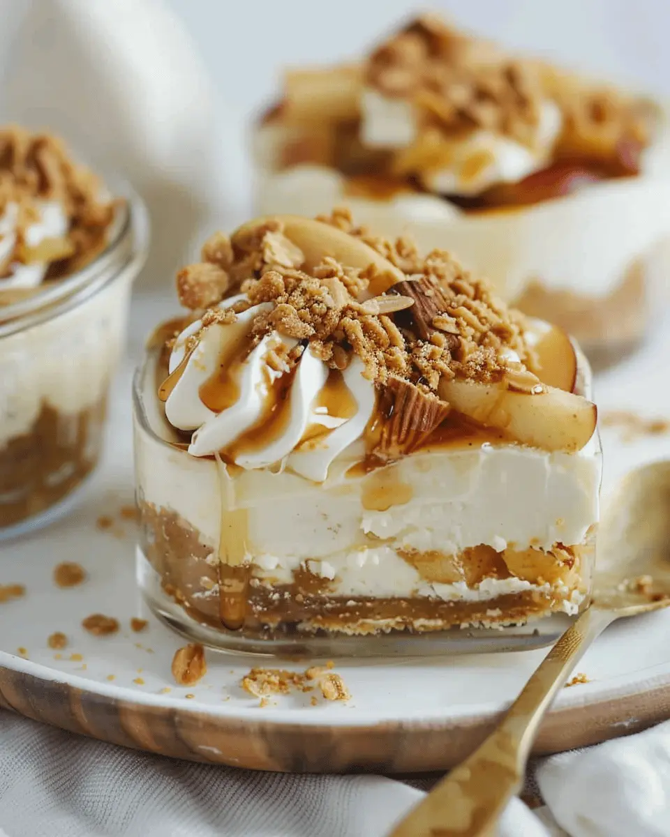 Your No-Bake Apple Cheesecake is the perfect showstopper for any gathering. To elevate your presentation, consider serving individual portions in mason jars or small cups. This not only makes for a chic display but also allows guests to grab their own delightful treat without worrying about slicing. You can also add a scoop of caramel sauce or a sprinkle of crushed graham crackers on top as a crunchy garnish.