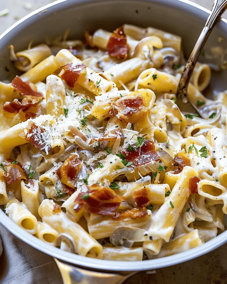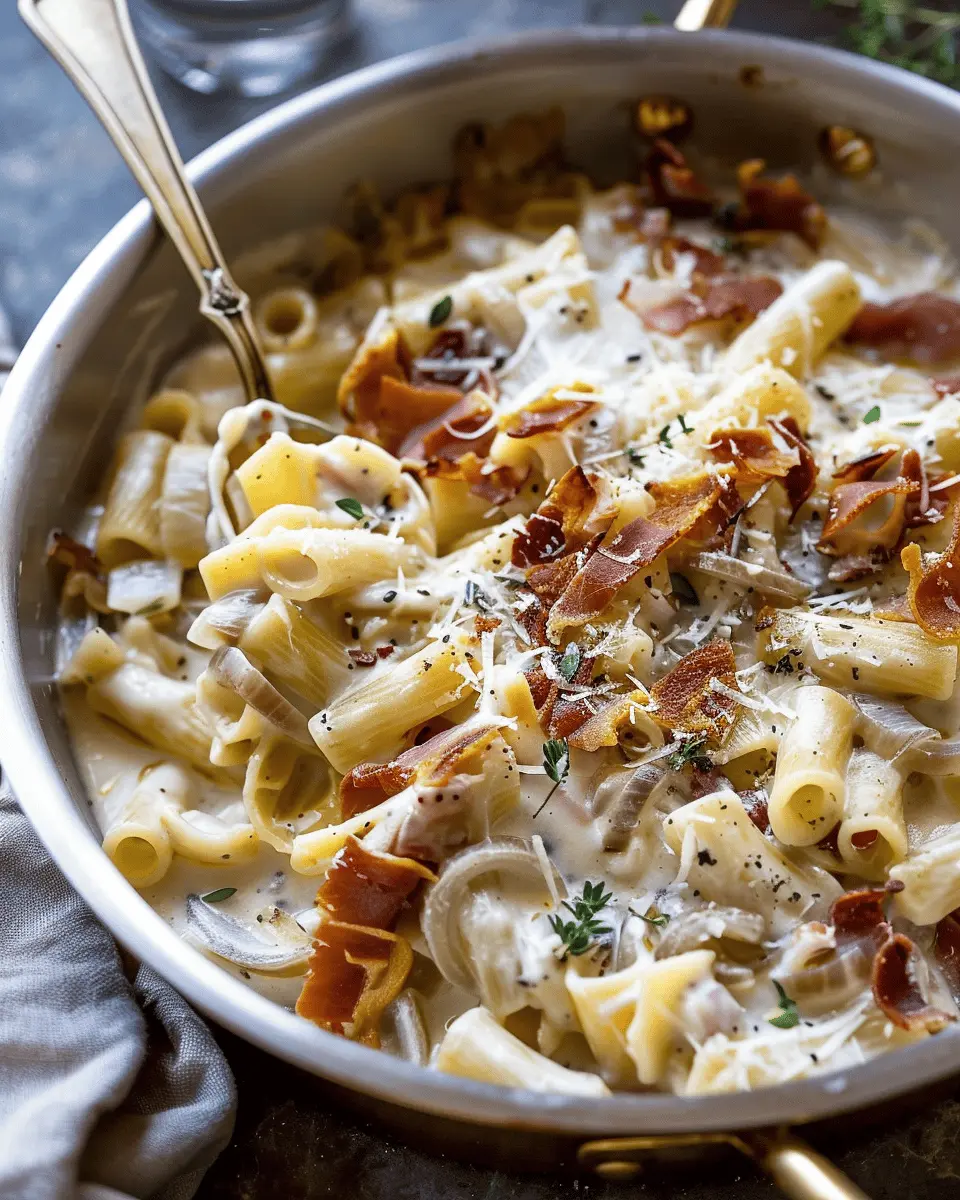 Discover the rich flavors of One Pot French Onion Pasta with Crispy Turkey Bacon, a delightful and hearty dish perfect for any occasion.