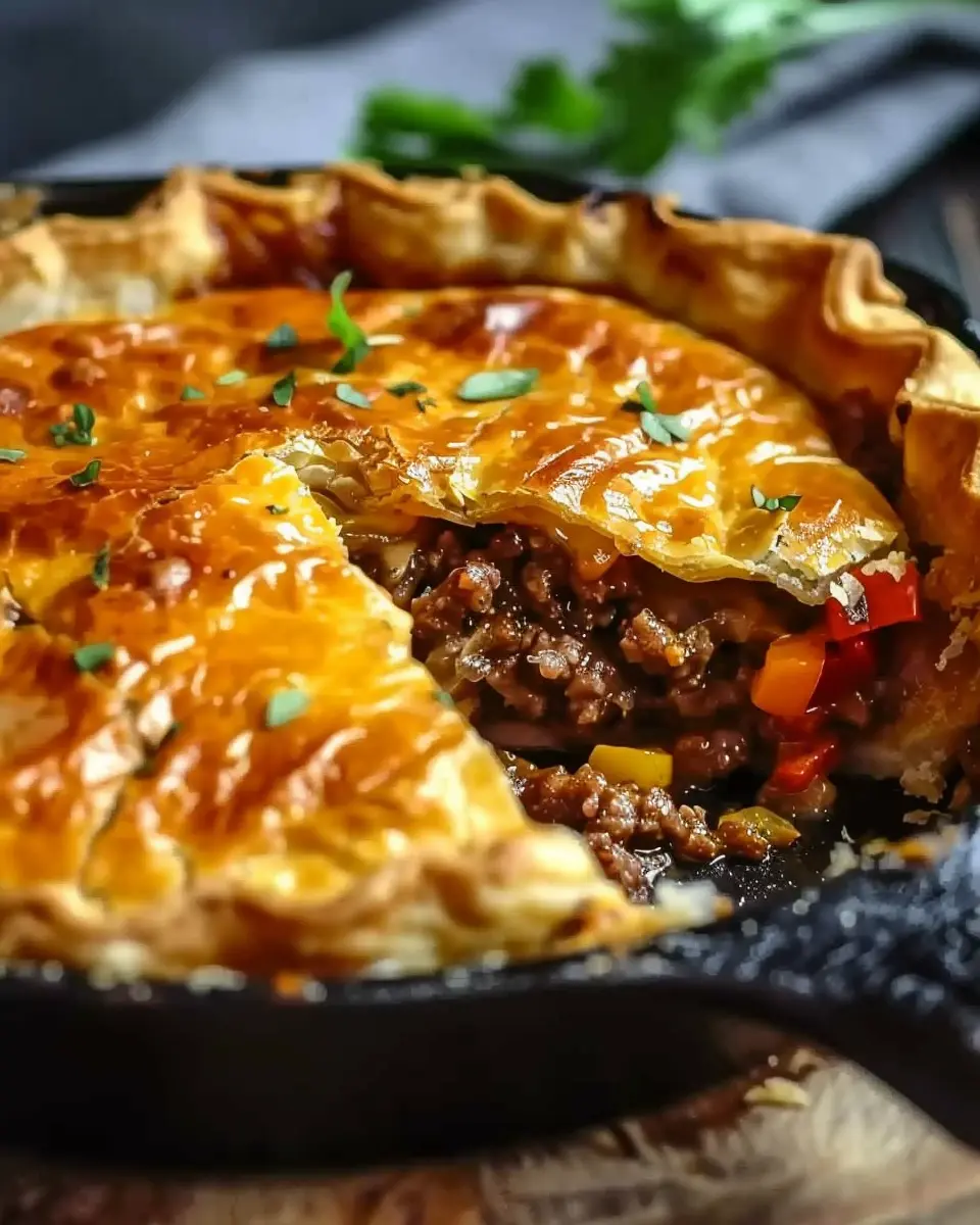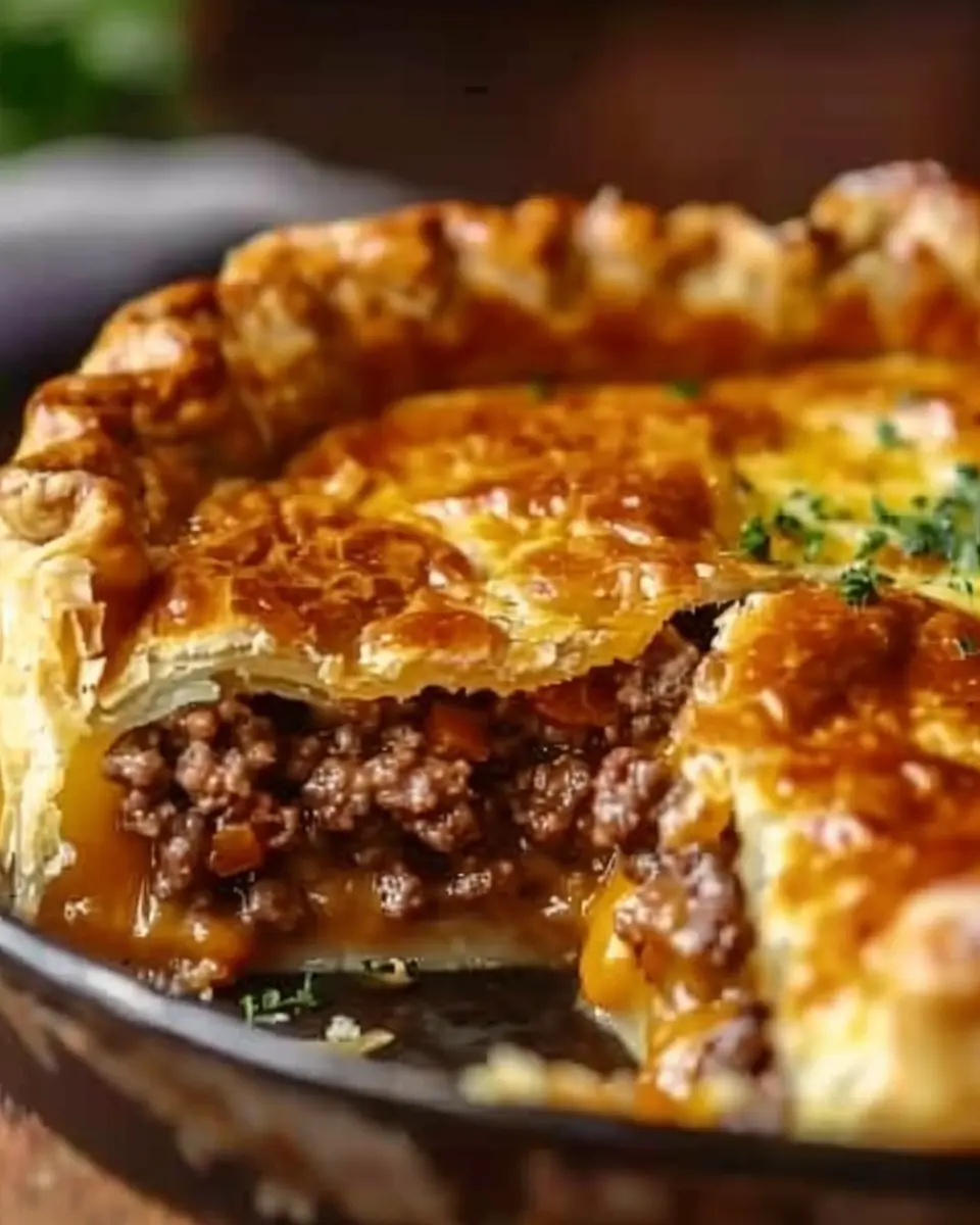 While your beef mixture simmers, it’s time to prepare the pie crust. If you’ve opted for store-bought pastry, roll it out to fit your pan. If you’re feeling adventurous and want to make your own, use this basic pie pastry recipe for a homemade touch.