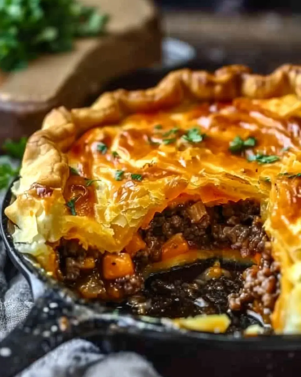 One-Pan Cheeseburger Pie Dinner is an indulgent and easy-to-make meal that combines the flavors of a classic cheeseburger in a savory pie format.