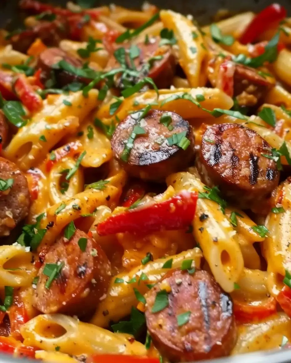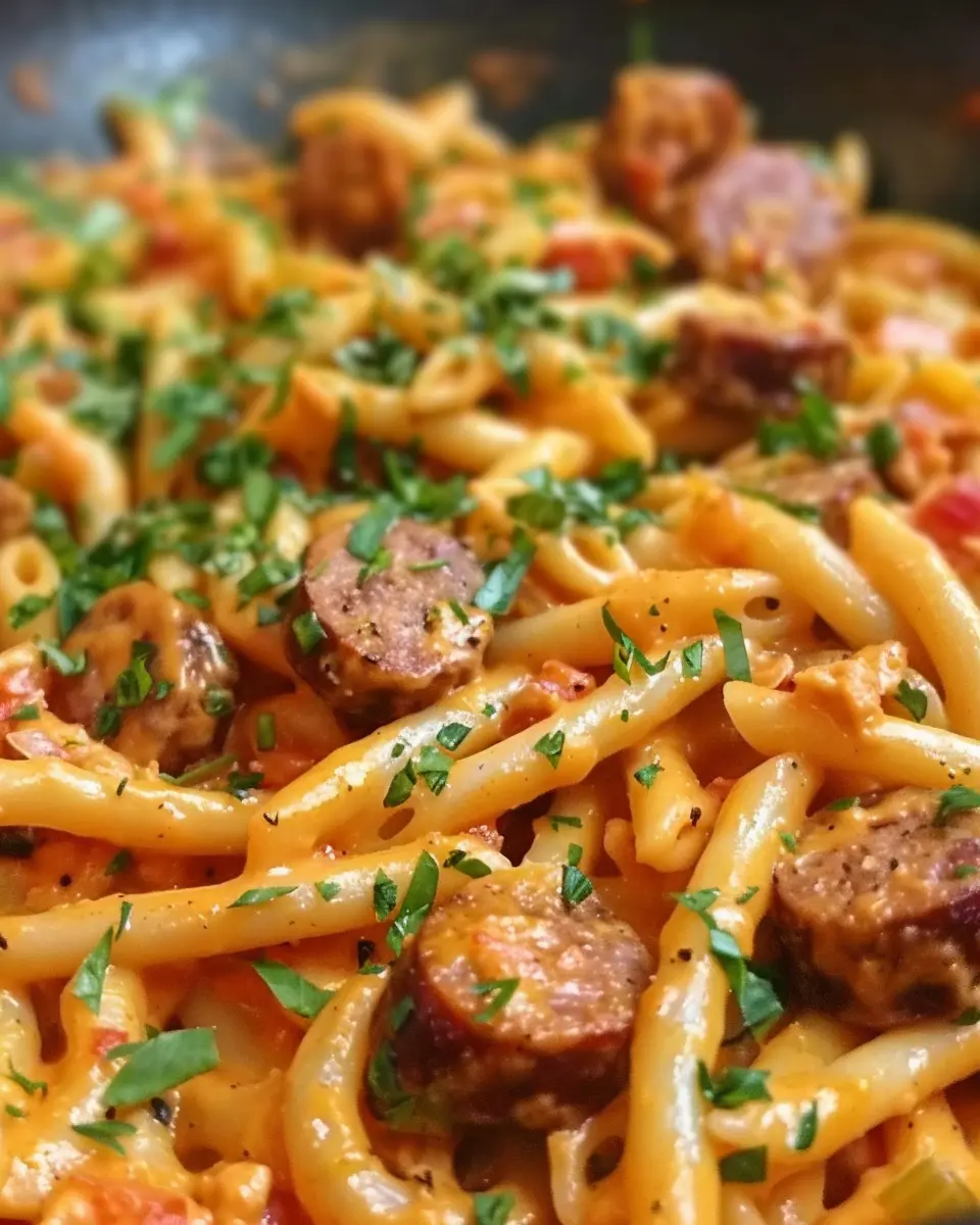 A comforting one-pot dish combining creamy sauce, spicy flavors, and sausage, perfect for a quick meal.