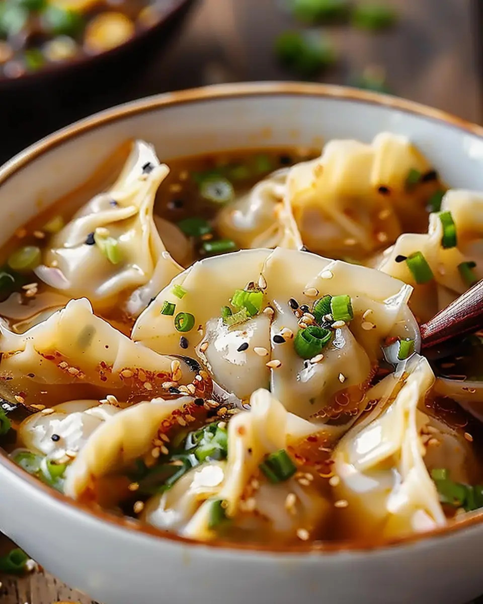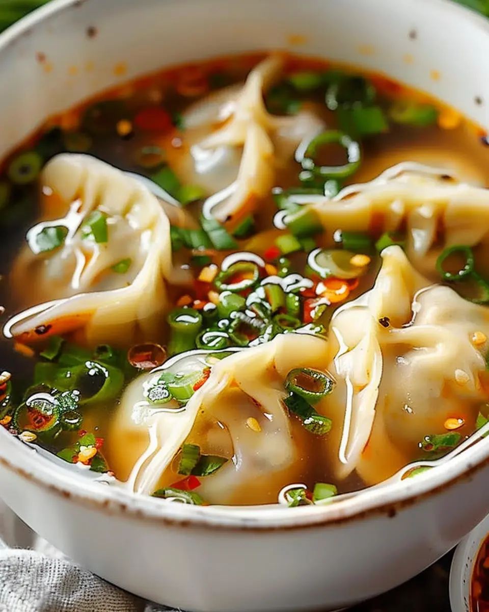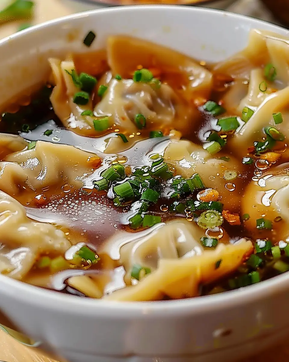 A comforting bowl of potsticker soup that combines the flavors of traditional dumplings with a savory broth.