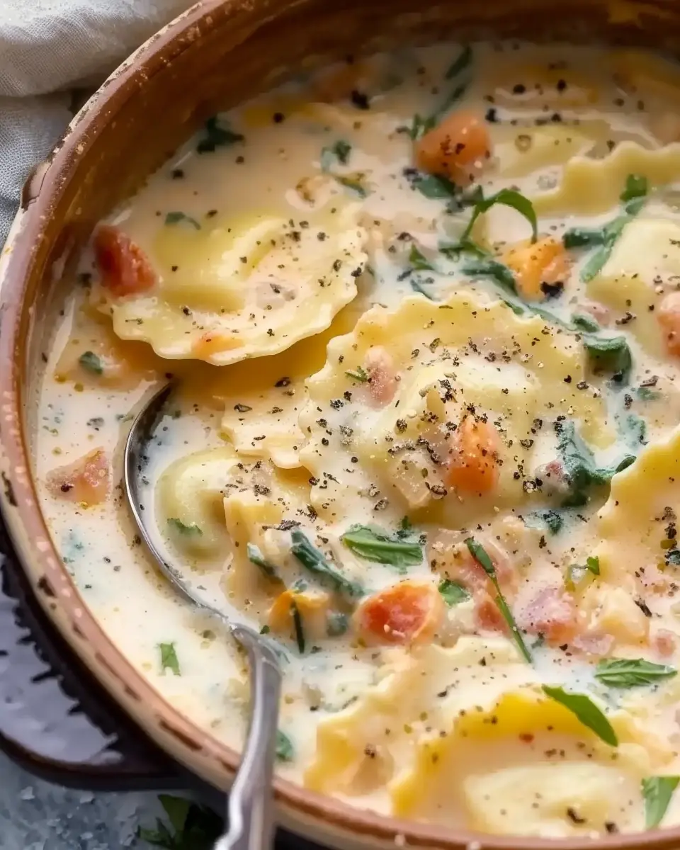 This creamy Tuscan ravioli soup combines the rich flavors of turkey bacon with tender ravioli, creating a delightful meal perfect for any occasion.