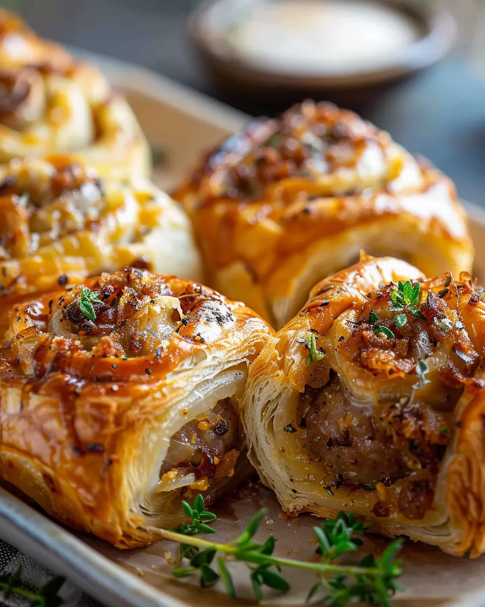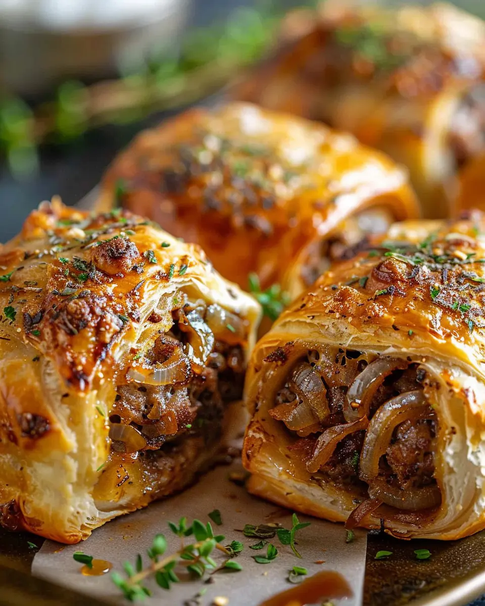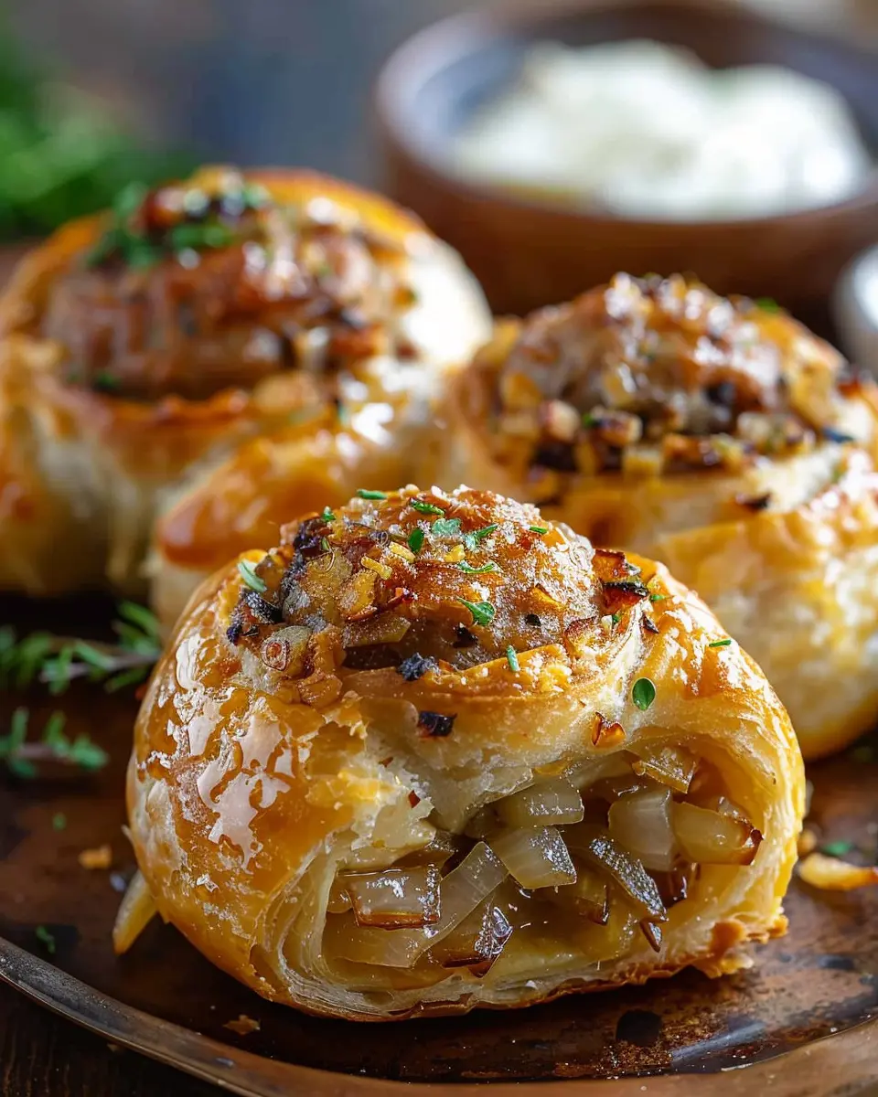 Deliciously savory sausage rolls filled with rich French onion flavor, perfect for any gathering.