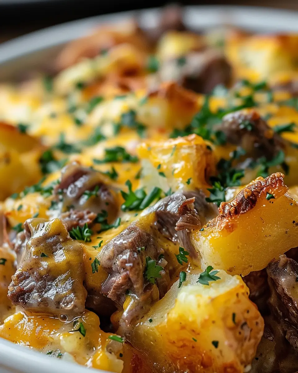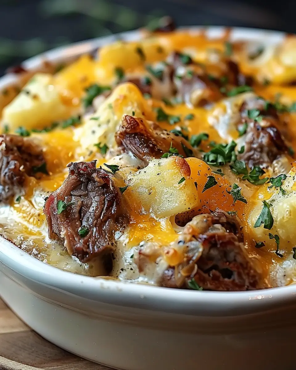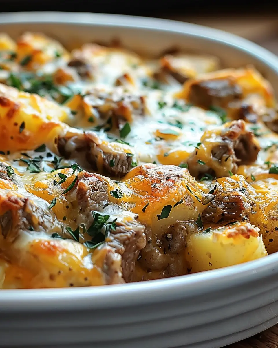 A comforting dish made with tender steak, creamy potatoes, and cheddar cheese, perfect for easy dinners.