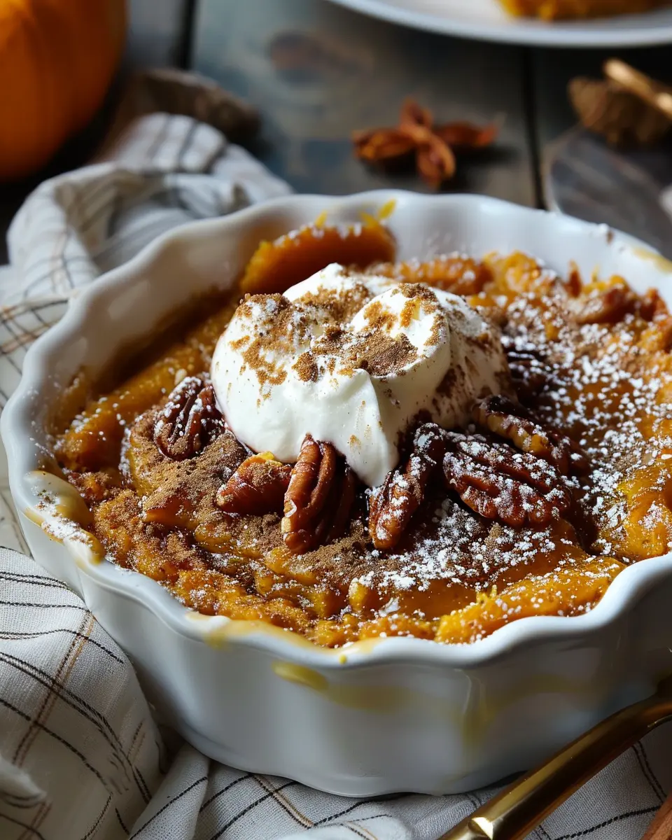 Keywords: Warm Spiced Baked Pumpkin Cobbler, Pumpkin, Fall Dessert, Cozy Recipe